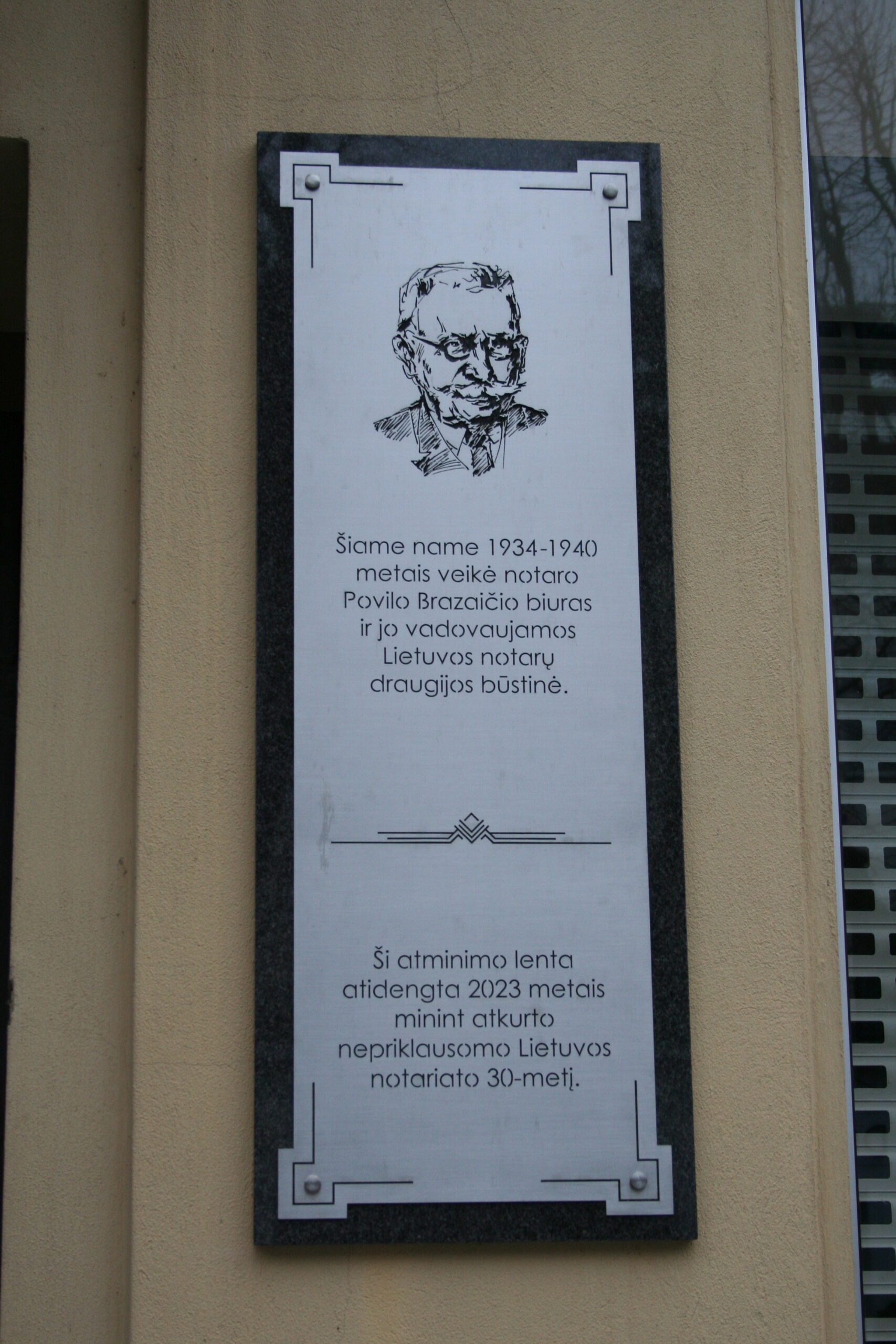 - 2024 m. Lietuvos notarų rūmų iniciatyva įrengta memorialinė lenta (autorius Gediminas Piekuras) ant pastato Laisvės al. 74: „Šiame name 1934–1940 metais veikė notaro Povilo Brazaičio biuras ir jo vadovaujamos Lietuvos notarų draugijos būstinė. Ši atminimo lenta atidengta 2023 metais minint atkurto nepriklausomo Lietuvos notariato 30-metį“.
